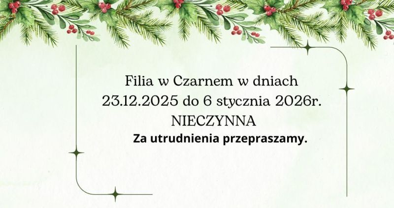 Biblioteka w Czarnem nieczynna od 24 grudnia do 31grudnia 2024r. Za utrudnienia przepraszamy.