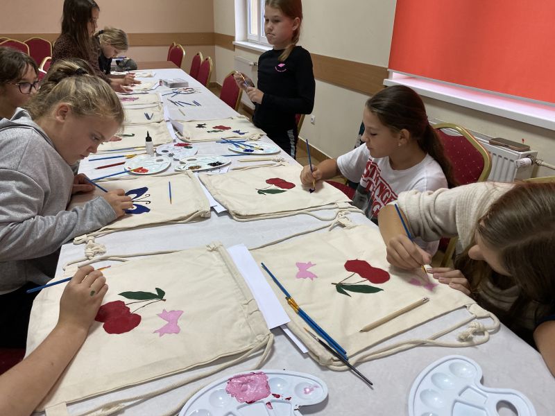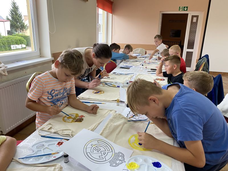Warsztaty manualne w Klubie Młodzieżowym w Wielgiem 2 Podczas ostatnich zajęć uczestnicy malowali materiałowe worki- każdy ozdobiony własnym wzorem. Powstały barwne motyle, kwiaty, wiśnie oraz loga ulubionych klubów sportowych.