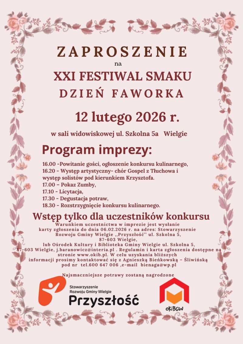 Stowarzyszenie Rozwoju Gminy Wielgie Przyszłość i Ośrodek Kultury i Biblioteka Gminy Wielgie zaprasza na XXI Festiwal Smaku Dzień Faworka 12 lutego 2026 r. w sali widowiskowej ul. Szkolna 5a Wielgie.