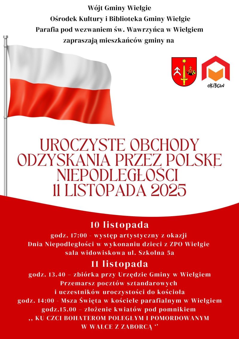 10 listopada godz. 17:00 - występ artystyczny z okazji Dnia Niepodległości w wykonaniu dzieci z ZPO Wielgie sala widowiskowa ul. Szkolna 5a 11 listopada godz. 13.40 – zbiórka przy Urzędzie Gminy w Wielgiem Przemarsz pocztów sztandarowych i uczestników uroczystości do kościoła godz. 14:00 - Msza Święta w kościele parafialnym w Wielgiem godz.15.00 – złożenie kwiatów pod pomnikiem ,, Ku Czci Bohaterom Poległym i Pomordowanym w Walce z Zaborcą ‘’.