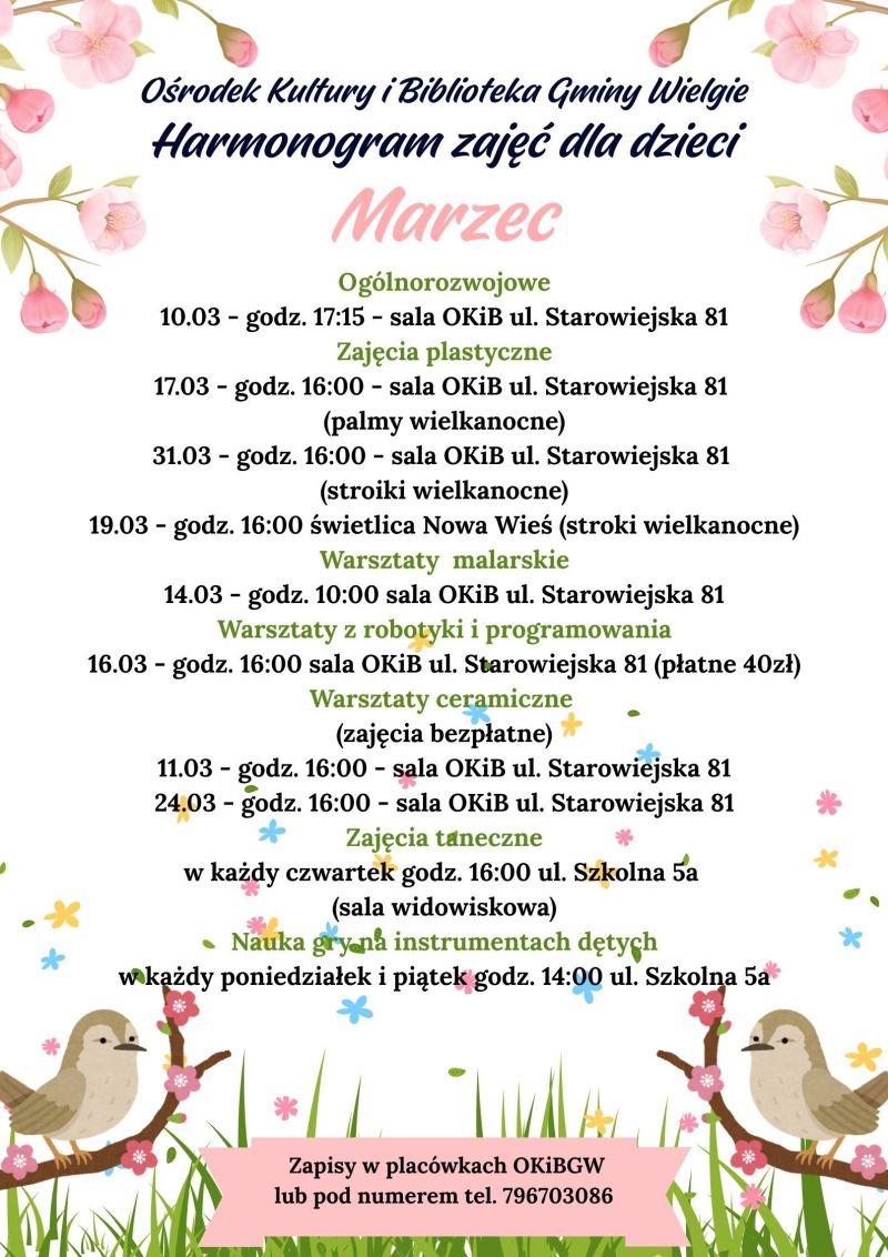 Ośrodek Kultury i Biblioteka Gminy Wielgie Harmonogram zajęć dla dzieci marzec